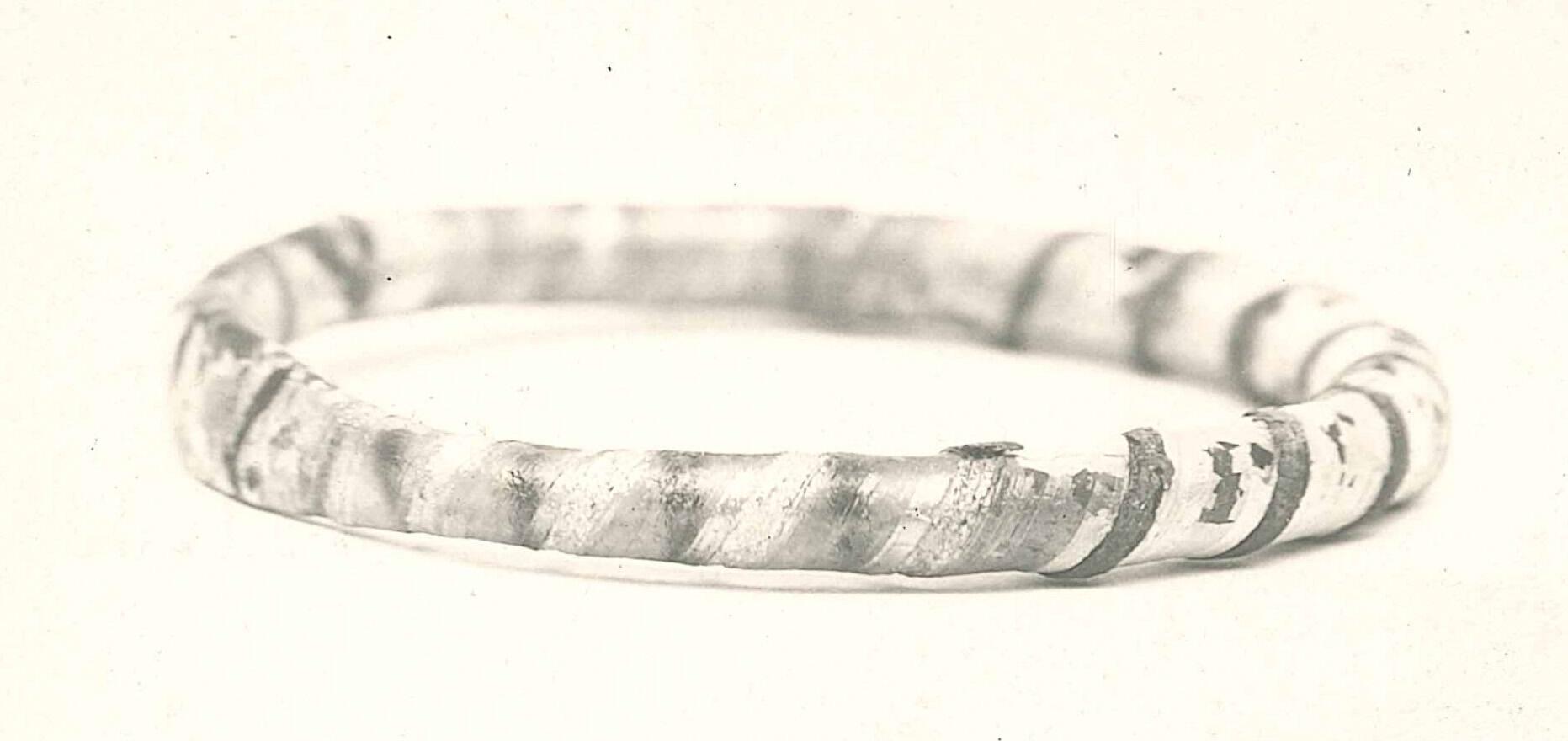 DescriptionCylindrical glass stick of translucent light greenish glass around which a thread of manganese purple glass is plastically applied, forming spirals. Entire stick shows evidence of twisting before being shaped into a circle.