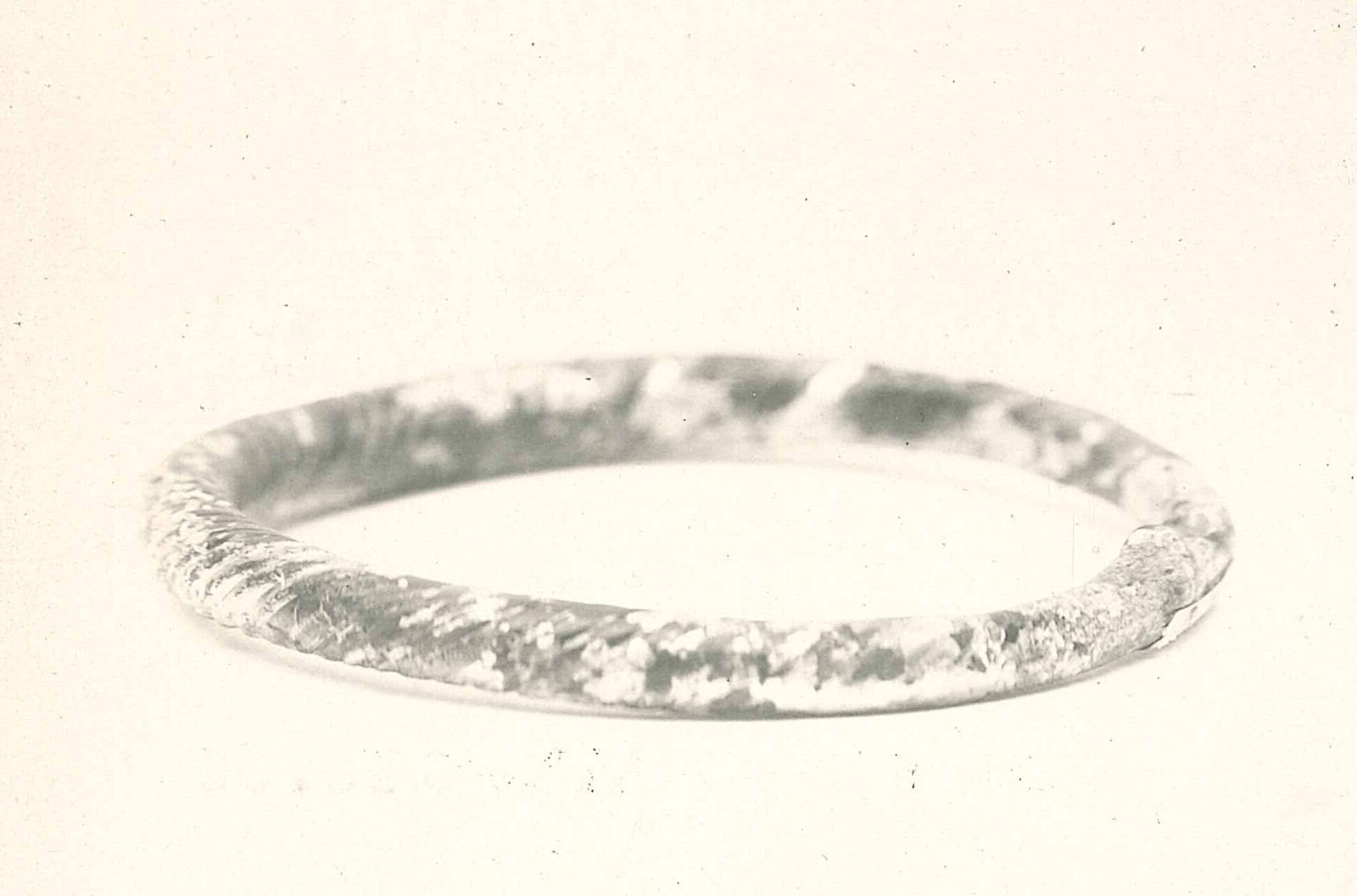 DescriptionCylindrical glass stick of translucent amber-brown glass, twisted like a rope and shaped into a circle. Green metallic iridescence.