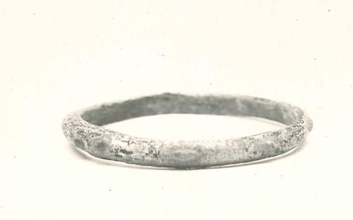 DescriptionPlain cylindrical glass stick shaped into circle. Translucent greenish glass, with iridescence.