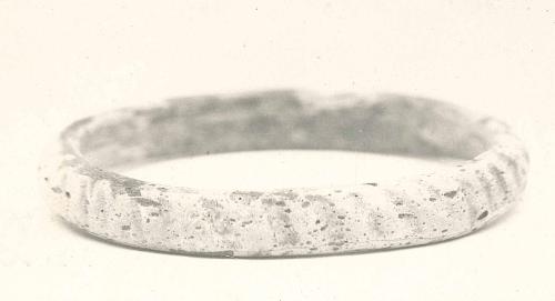 DescriptionRibbon of translucent dark cobalt-blue glass, bent into the shape of a circle and ornamented by regular impressions into the glass while pliable. Thick earthy film.