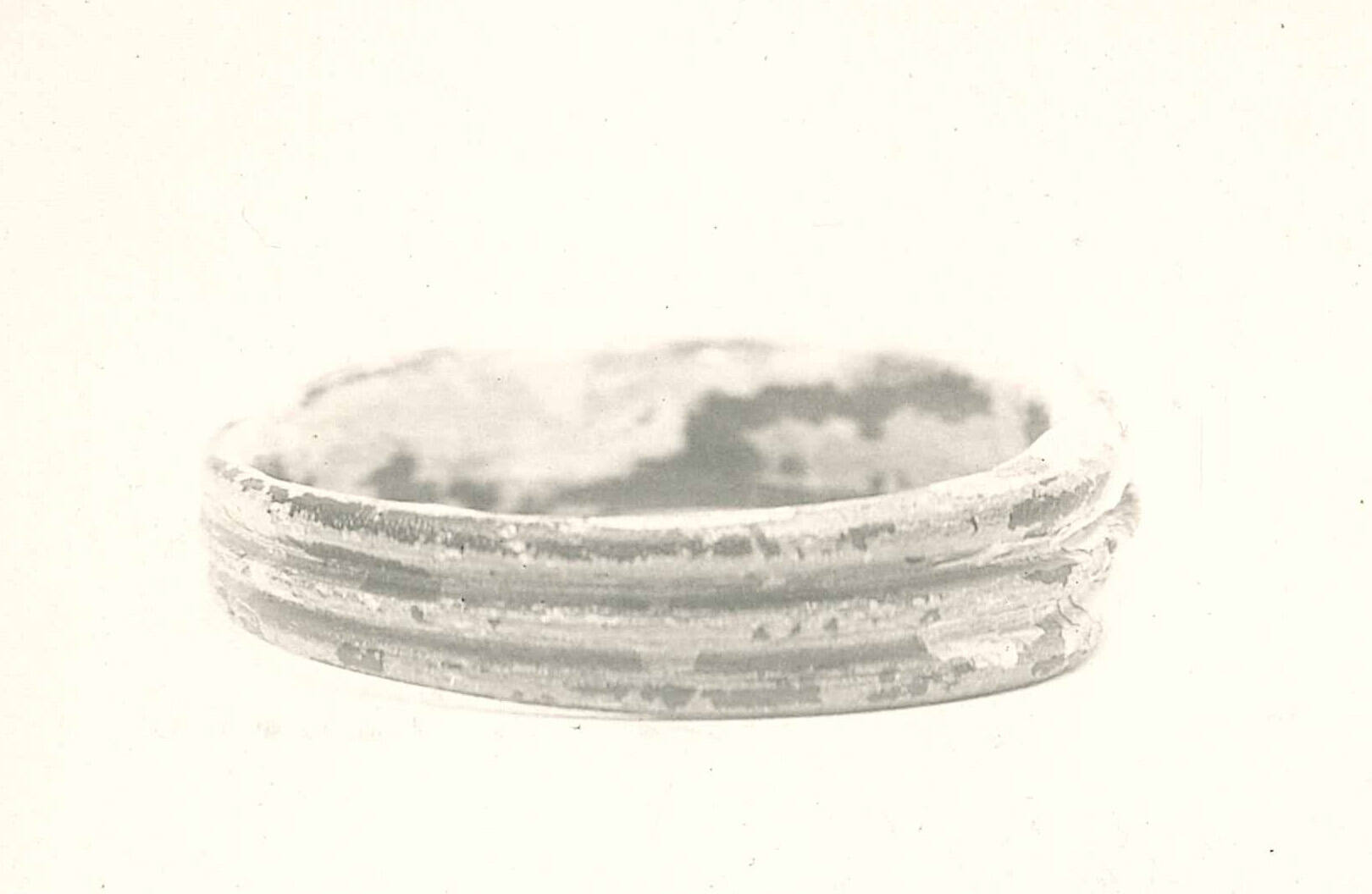 DescriptionGlass ribbon of translucent amber yellow glass, bent into the shape of a circle. Iridescence.