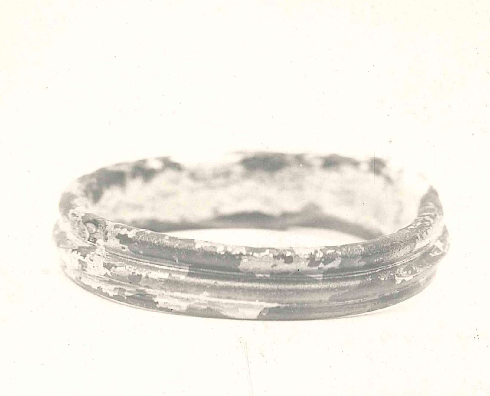 DescriptionGlass ribbon with two deep longitudinal grooves, bent into the shape of a circle. Translucent amber-yellow glass. Metallic iridescence.