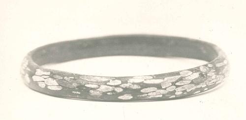 DescriptionGlass ribbon of opaque blackish glass, bent into the shape of a circle. The outside of the ring decorated with plastically applied and impressed dots of opaque white, red and blue glass.