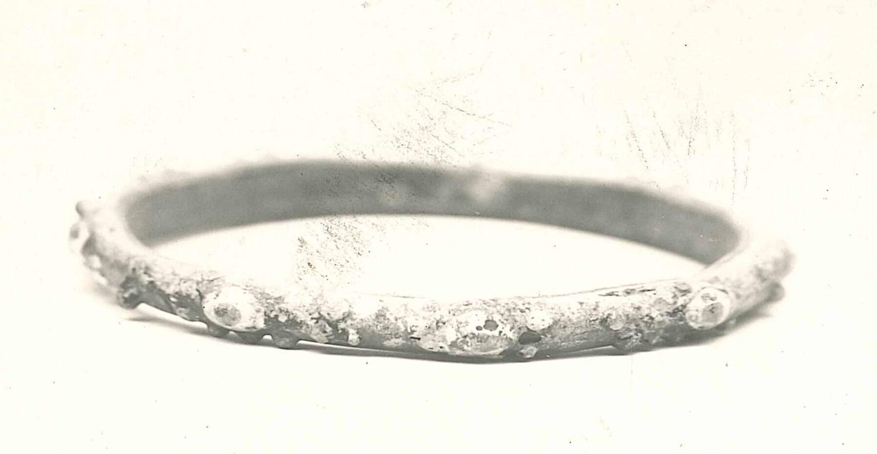 DescriptionGlass ribbon bent into shape of a circle. Flat inside, round outside. Body of translucent greenish glass, coated by opaque green glass outlined by opaque yellow on upper and lower rim. Ornamented with repeated eye motive; blue pupil, white iris, red eyelids, surrounded by rows of yellow and white raised dots.