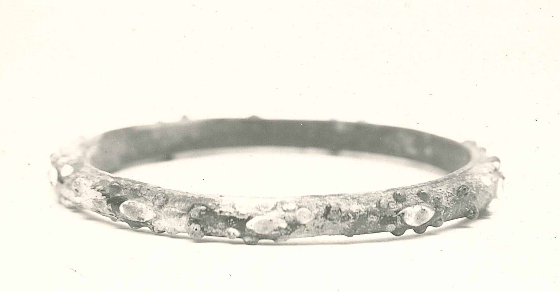 DescriptionGlass ribbon bent into the shape of a circle. Body of translucent greenish glass, coated with opaque green glass, outlined with yellow on upper and lower rim. Ornamented with repeated eye motif, plastically applied. Cobalt blue pupil, white iris, red eyelid, surrounded by raised opaque white and yellow dots. Raised red dots between.