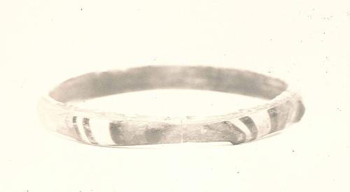 DescriptionRibbon of translucent light greenish glass bent into the shape of a circle. Coated on the outside with opaque green glass and ornamented with plastically applied drops of glass, striped orange, yellow, black and white.