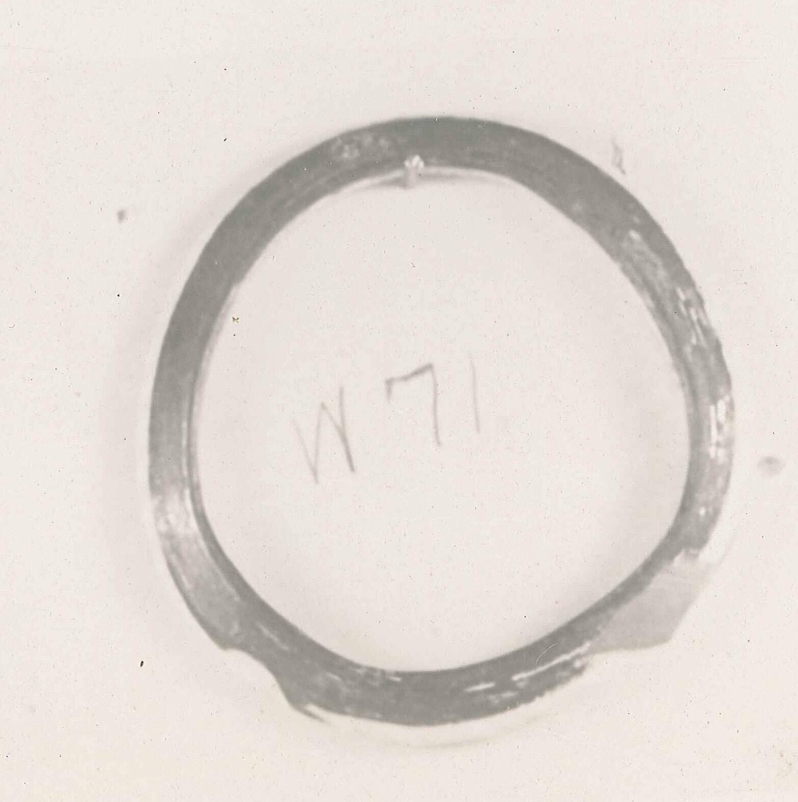 DescriptionGlass stick of a triangular profile, bent into shape of a circle. Opaque blackish glass ornamented on rim with plastically applied yellows and orange-red glass threads twisted together. One splash of green glass added.