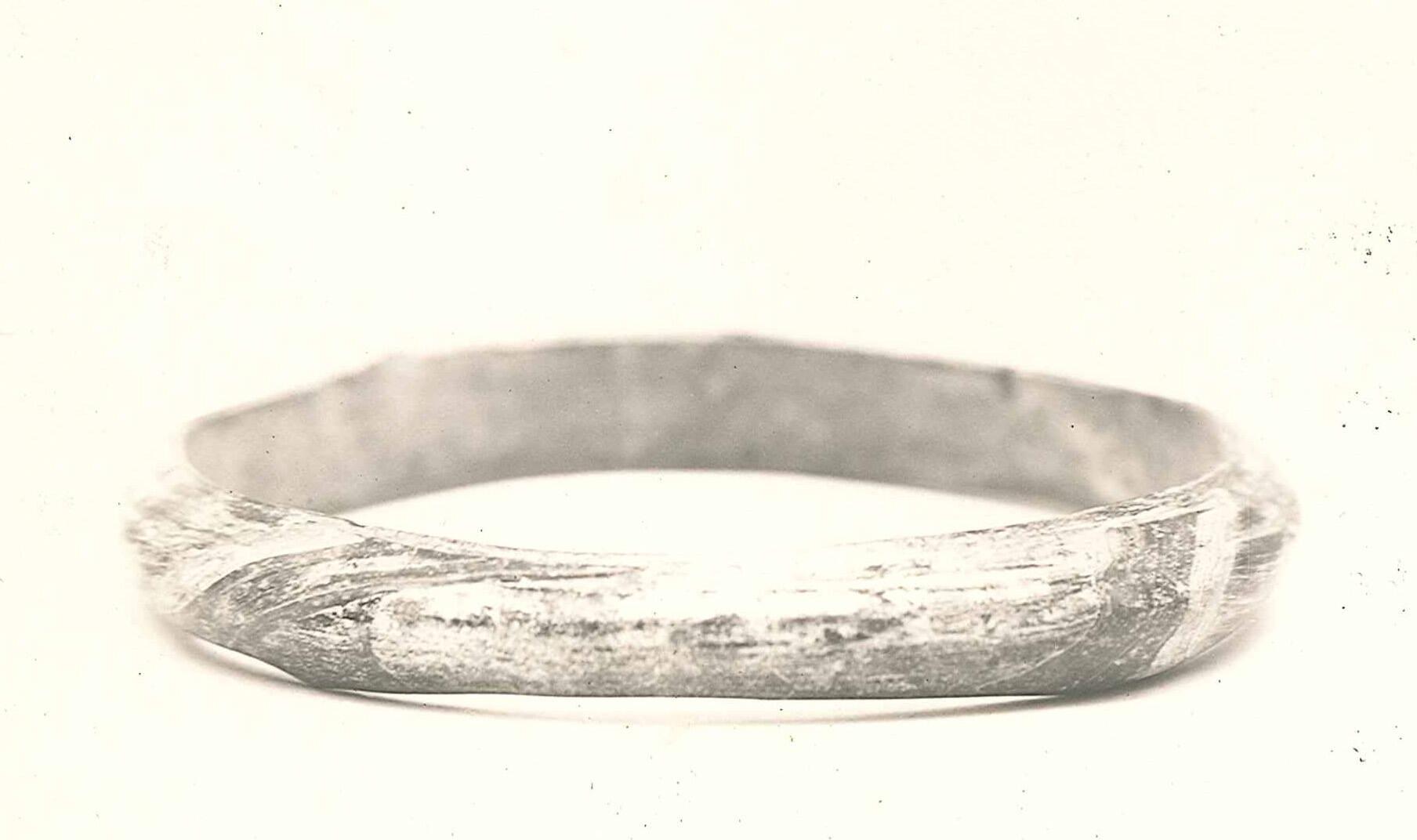 DescriptionGlass stick of vaguely triangular profile bent into the shape of a circle. Base of triangle forms inside. Opaque blackish glass, ornamented on the rim with a series of color splashes, pink, green and yellow. Slight iridescence.