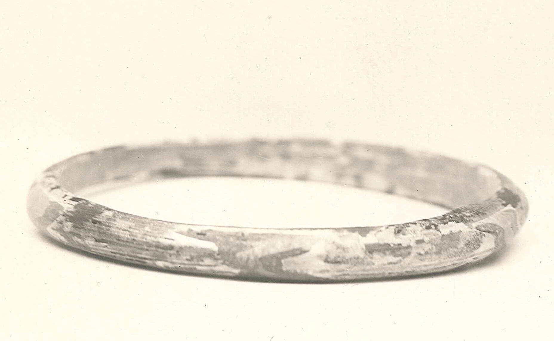 DescriptionGlass ribbon bent into the shape of a circle. Opaque blackish glass ornamented with a series of splashes of opaque green and yellow glass. Grayish iridescence.