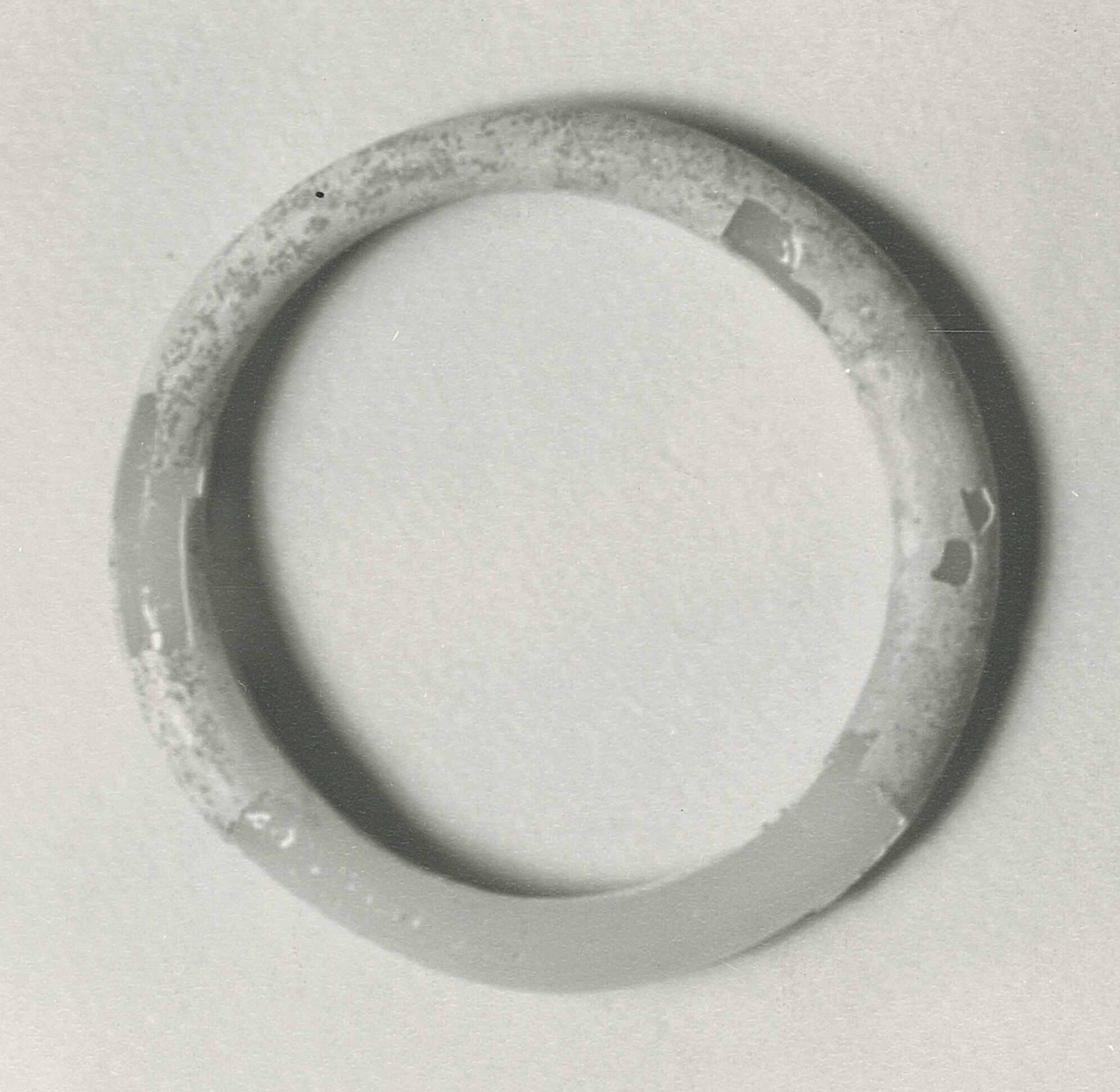 DescriptionTranslucent, cloudy gray-white glass; straight inner wall.