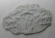 DescriptionThis oval medallion is made of monochrome glass shaped through mold-pressing and cutting. The complex composition depicts a nude, bearded man standing on the bank of a river beneath a canopy, with two pairs of horses. In the upper section of the medallion are two female genii and two amorini.