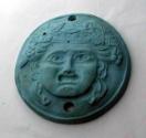 DescriptionThis round, convex medallion is made of opaque pale blue glass and was produced using mold-pressing and deep cutting techniques. The design features a theater mask that fills the entire surface. The broad face is carved in high detail, with large eyes, incised pupils and eyelids, a furrowed brow, and an open mouth—all contributing to a dramatic, worried expression. The hair is deeply striated and styled in thick, leonine locks, encircled by a fillet at the hairline and a wreath of grape leaves and grape clusters across the temples. Ribbon-like elements trail back from either side. Holes drilled above and below the mask suggest the medallion may have been mounted or suspended.
