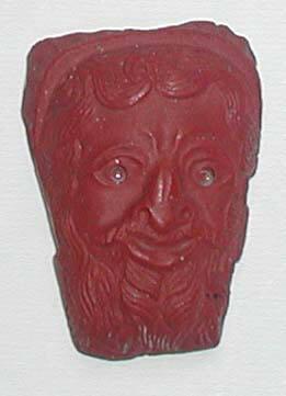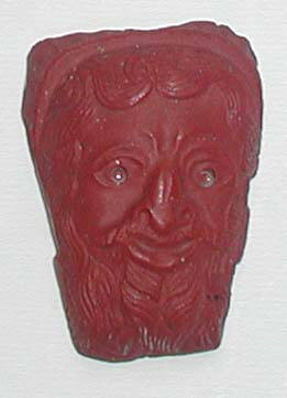 DescriptionThis high-relief, trapezoidal fragment is made of opaque red glass and was shaped using mold-pressing and deep cutting techniques. It depicts the head of a smiling, bearded Silenus with a broad, flat face, arched raised eyebrows, large eyes with drilled pupils, a flaring nose, and a full lower lip. His long moustache is tooled, and his hair and beard are rendered in thick, striated, wavy locks. A twisted notched band and a fluted, halo-like band encircle the top of the head. The back is flat.