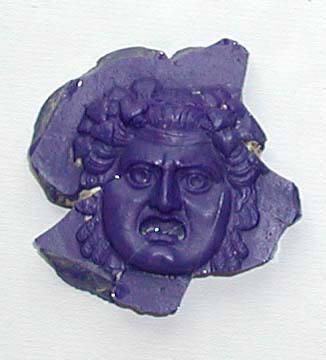 DescriptionThis flat plaque fragment is made of opaque cobalt blue glass and was created using mold-pressing and deep cutting techniques. It preserves a theater mask carved in relief, featuring large drilled eyes, a furrowed brow, a prominent hooked nose, a hollowed frowning mouth, and a cleft chin. The hair is arranged in full leonine locks partially covered by a twisted wreath of grape clusters and leaves, with sausage curls falling around the neck. A fillet marks the hairline. This mask is of the same type as seen on objects 1923.1514 and 1923.1674 in the collection.