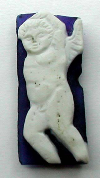 DescriptionThis rectangular strip fragment of cameo glass is carved in opaque white over a translucent cobalt blue ground. The scene depicts a stocky, frontal figure of Eros (Cupid) moving to the left. The figure’s left arm curves upward around the head, while the right arm is not shown. One wing is visible. The face is chubby with incised features, and the hair is also incised. The back is diagonally ribbed, and two finished edges are preserved. The surface is pitted, and the edge is chipped.