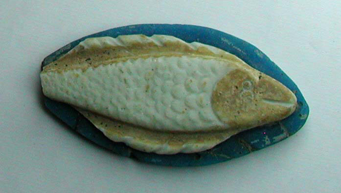 DescriptionThis is a flat fragment from a cameo glass plaque. The relief design, carved in opaque white glass against an opaque turquoise blue background, depicts a large fish in high relief. The fish’s body features curved contours and detailed fins, with modeling that rises noticeably from the surface.
