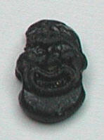 DescriptionSmall, oval bead molded in relief to depict a theater mask or grotesque face. The face features close-set eyes, high cheeks, a protruding nose, and a gaping mouth. A row of curls spans the forehead. The reverse is flat. Two horizontal perforations run through the center for stringing. Made of black glass.