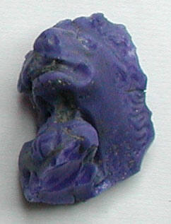 DescriptionFragment of molded glass depicting a lion in high relief. The opaque blue glass preserves a three-quarter view of the lion's head and raised paw. The animal’s mouth is open, with deeply set eyes and a wavy mane lying flat against its stretched neck. The paw appears lifted onto an object, positioned just beneath the chin.