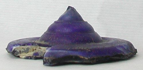 Center portion of pyxis lid, with conical ridged center and several concentric grooves on top surface. Done in opaque blue glass.