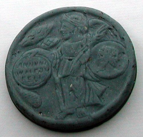 Label TextThis small circular medallion, pressed in opaque pale blue glass, reproduces a complex Roman iconographic program associated with New Year rituals. A winged female figure—Victory—stands in relief, holding a wheat sheaf and raising a shield inscribed (though now illegibly) with what was likely the Latin greeting "Annum Novum Faustum Felicem" ("A Happy and Prosperous New Year"). To one side appears another shield, bearing the two-headed face of Janus, the Roman god of beginnings and transitions. Additional details include a pinecone and grain—symbols of fertility and seasonal renewal. Such motifs closely resemble those found on verified Roman New Year tokens, including oil lamps and coins exchanged as strenae, or well-wishing gifts, during the Kalends of January. The object's iconography resembles the imagery on 1st century CE terracotta lamps, but the crude execution of this unusual glass example may indicate it is a 19th century reproduction. This medallion was published in 1894 as part of the Coleman Collection of Antique Glass, assembled by Charles Caryl Coleman (1840–1928), an American painter and expatriate who lived in Rome and later Capri. Coleman, like many artist-collectors of his time, sourced decorative objects from the Italian antiquities market, often valuing aesthetic appeal over archaeological documentation.Published ReferencesSturgis, Russell, “The Coleman Collection of Antique Glass,” The Century Magazine, vol. 48, 1894, p. 555, fig. 8.