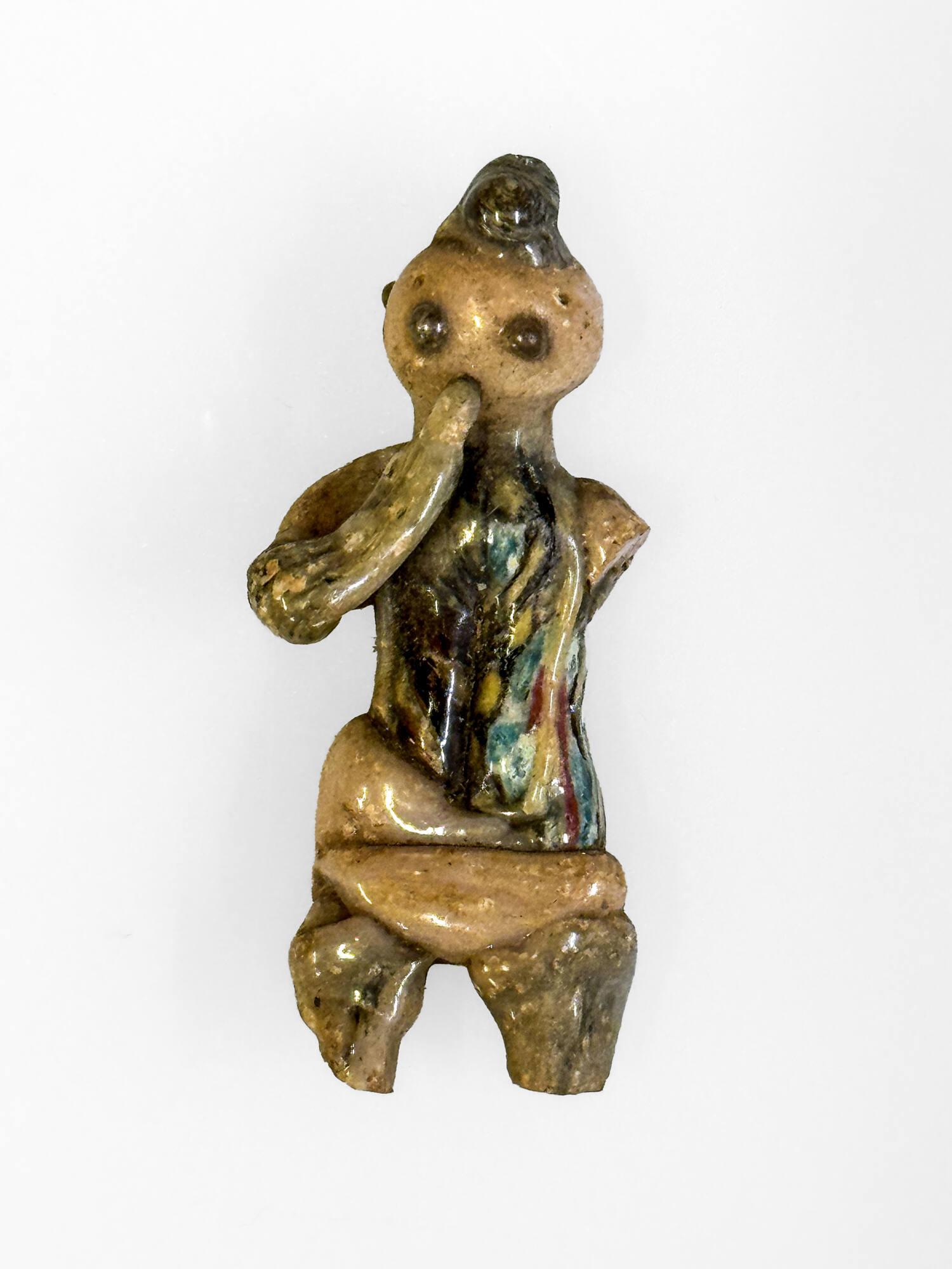 Label TextThis small glass figure represents Harpocrates, a Greco-Egyptian child god. With one finger raised to his mouth and a child’s topknot on his head, Harpocrates was adapted from the Egyptian god Horus the Child and came to symbolize silence and secrecy in Roman times. The torso is made from swirled blue, white, red, and black marbled glass.700-600 BCE