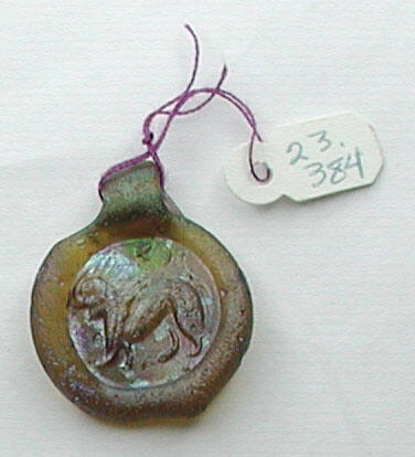 DescriptionTranslucent amber-yellow glass amulet with an integrated ring for suspension. The obverse features a relief depiction of a walking lion.