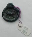 DescriptionSmall amulet made of translucent blue glass. The obverse shows a relief image of a walking lion. A ring at the top allows for suspension.