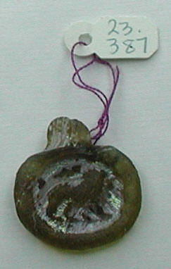 DescriptionAmulet made of translucent greenish glass. The front shows a relief of a walking lion. A suspension ring is formed at the top for wearing.