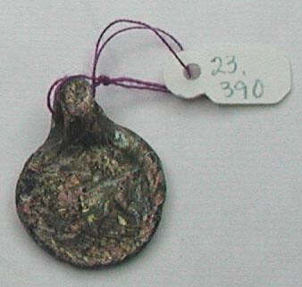 DescriptionSmall amulet made of translucent greenish glass with a relief image of a walking lion. A suspension ring is integrated at the top. The surface shows some incrustation.