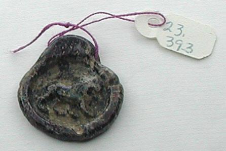 DescriptionAmulet made of translucent dark purple glass, mold-pressed with a relief image of a lion walking to the right. A suspension ring is integrated at the top. The surface shows iridescence and minor chipping.