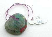 DescriptionThis small green glass disk has raised images on both sides: one side shows a winged woman, and the other shows an elephant. The surface is weathered.