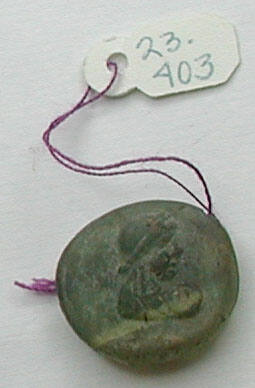 DescriptionSmall translucent green glass disk. One side is molded in relief with a profile bust of a figure, possibly female, shown with an arm raised and stylized hair. The reverse appears to depict a crouching animal, though the image is indistinct.
