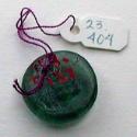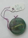 DescriptionSmall translucent green glass disk with relief decoration on both sides. One side depicts the profile bust of a female figure facing right. The reverse shows a less distinct image, possibly an elephant or a bearded male figure, also facing right.