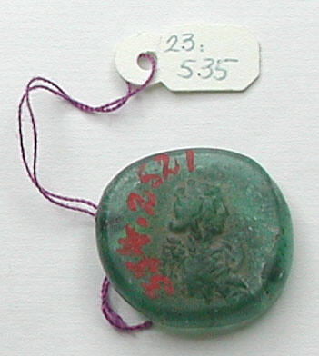 DescriptionSmall, round glass disk made of translucent greenish glass. Both sides feature low relief decoration. The form is irregular.