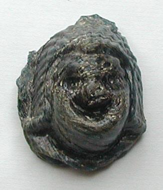 DescriptionTragic mask molded in dark semi-translucent greenish glass. To be used as vase ornament. Circular.
