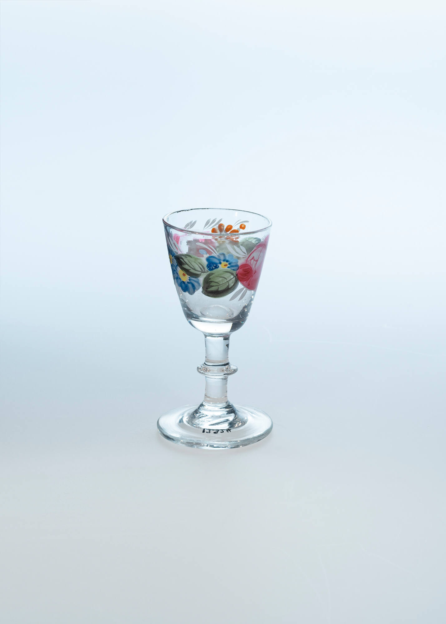 DescriptionClear white glass with band of flowers painted in colors around center.