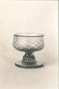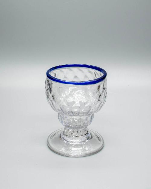 DescriptionClear white glass, goblet shaped. Diamond-quilted pattern, dark blue upper edge.