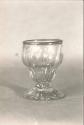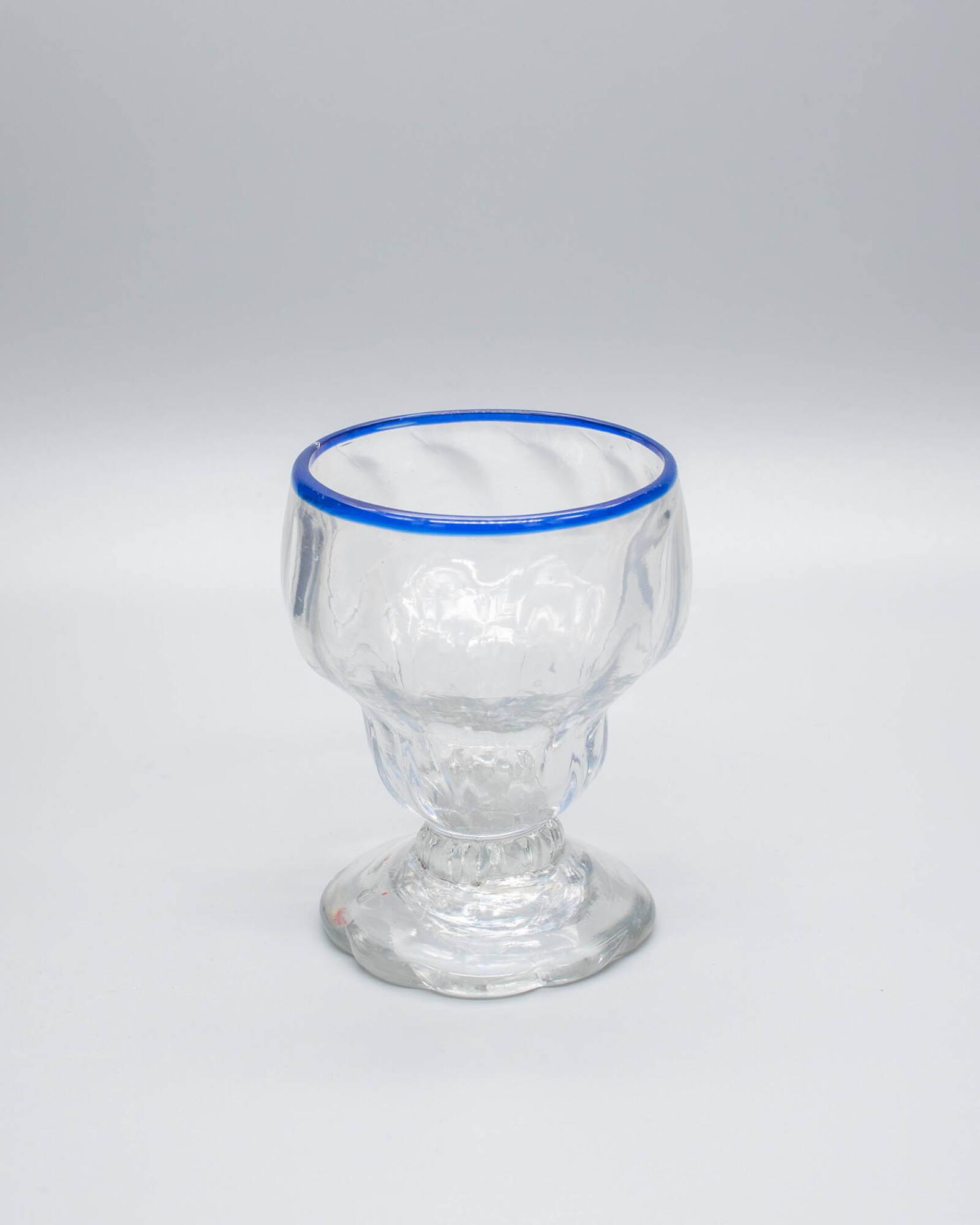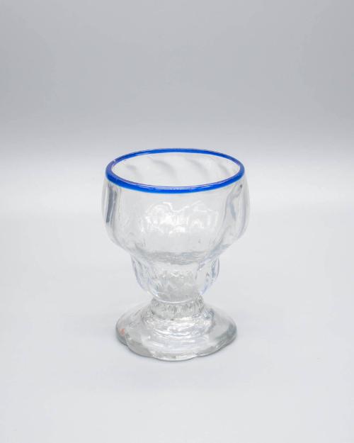 DescriptionClear white glass, goblet shape. Diagonally fluted pattern. Dark blue edge. Scalloped foot.