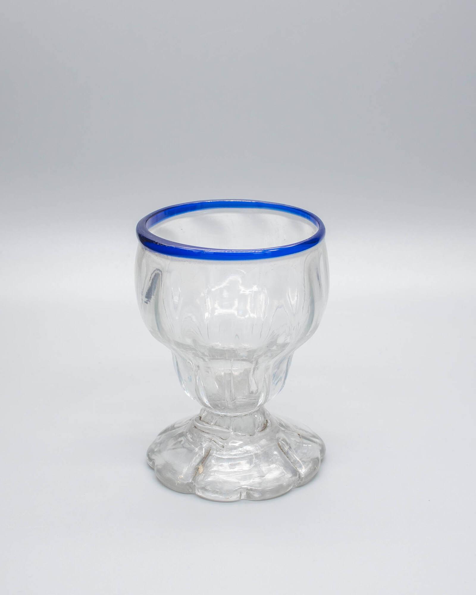 DescriptionClear white glass. Goblet shape, diagonally fluted pattern, dark blue edge and scalloped foot.