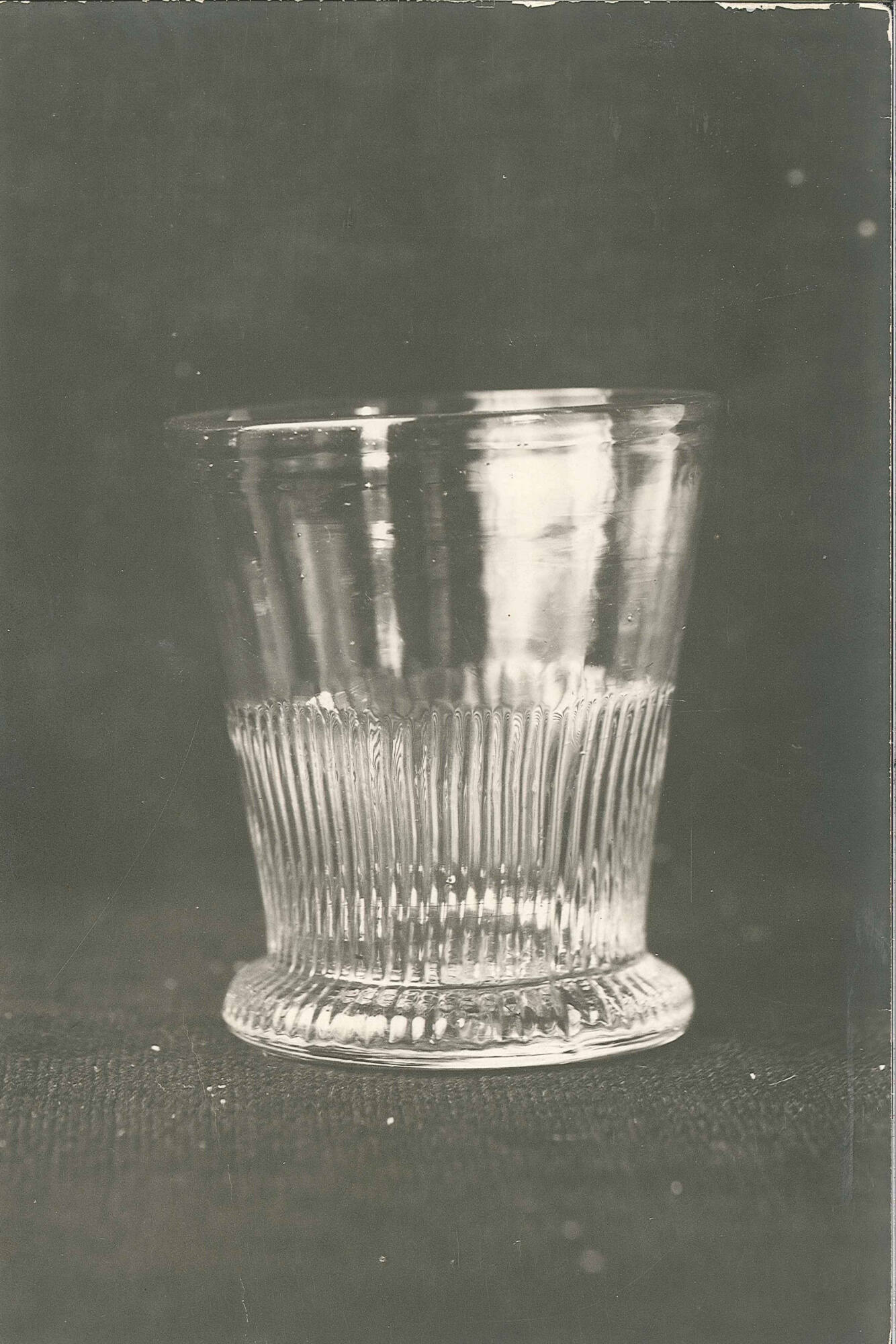 DescriptionClear white glass, fluted pattern below, blown in figured mold. Broad cushion base.