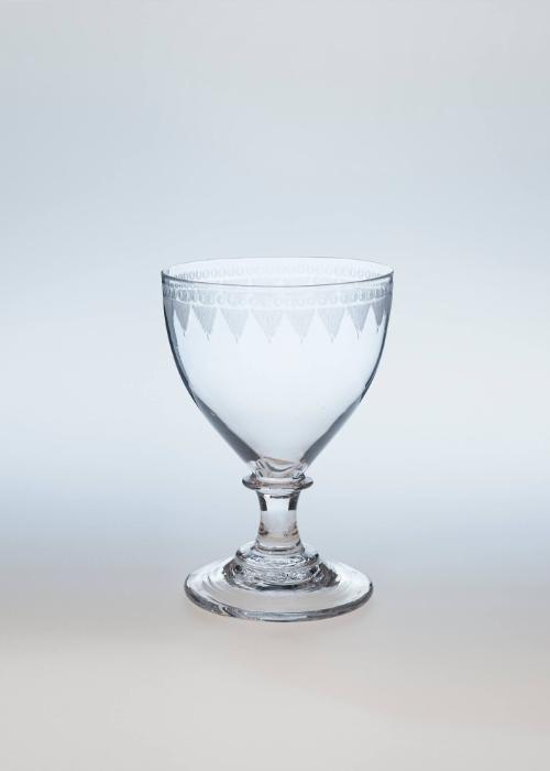 MediumGlass; blown bowl with applied knob stem, engraved.