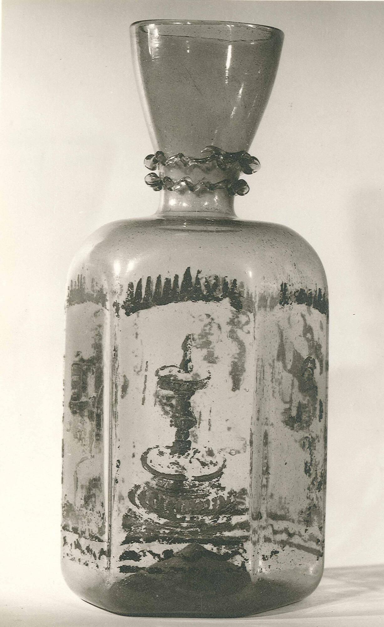 DescriptionHoney-colored glass, body of hexagonal form with painted decoration in each panel.