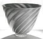 DescriptionLarge flaring shape of rose and opaque gray glass, flecked with gold-swirled ribbing showing opaque white edge