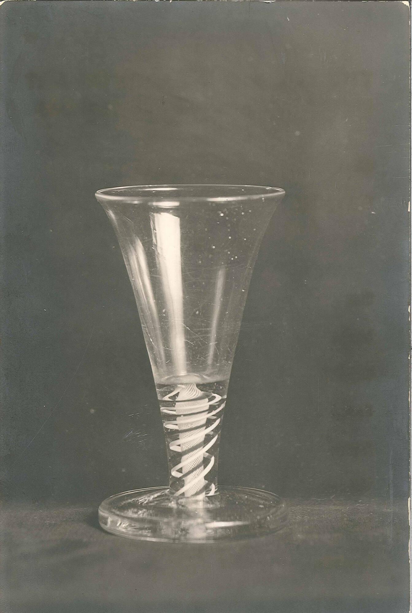 DescriptionFunnel shaped, with broad cushion foot. Red and white twist stem.