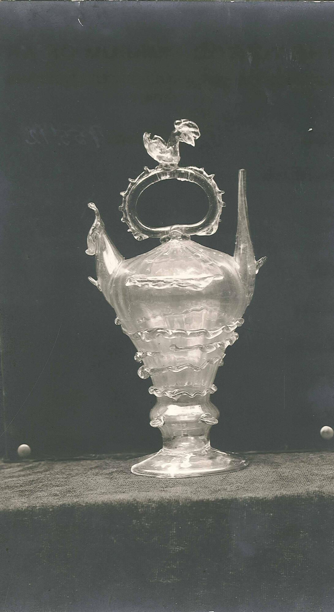 DescriptionSmoky color, decorated around the body with blue and green colored raised ornaments, serpentines. Neck and beak are surmounted by oval shaped handle with cock on top, decorated with blue.