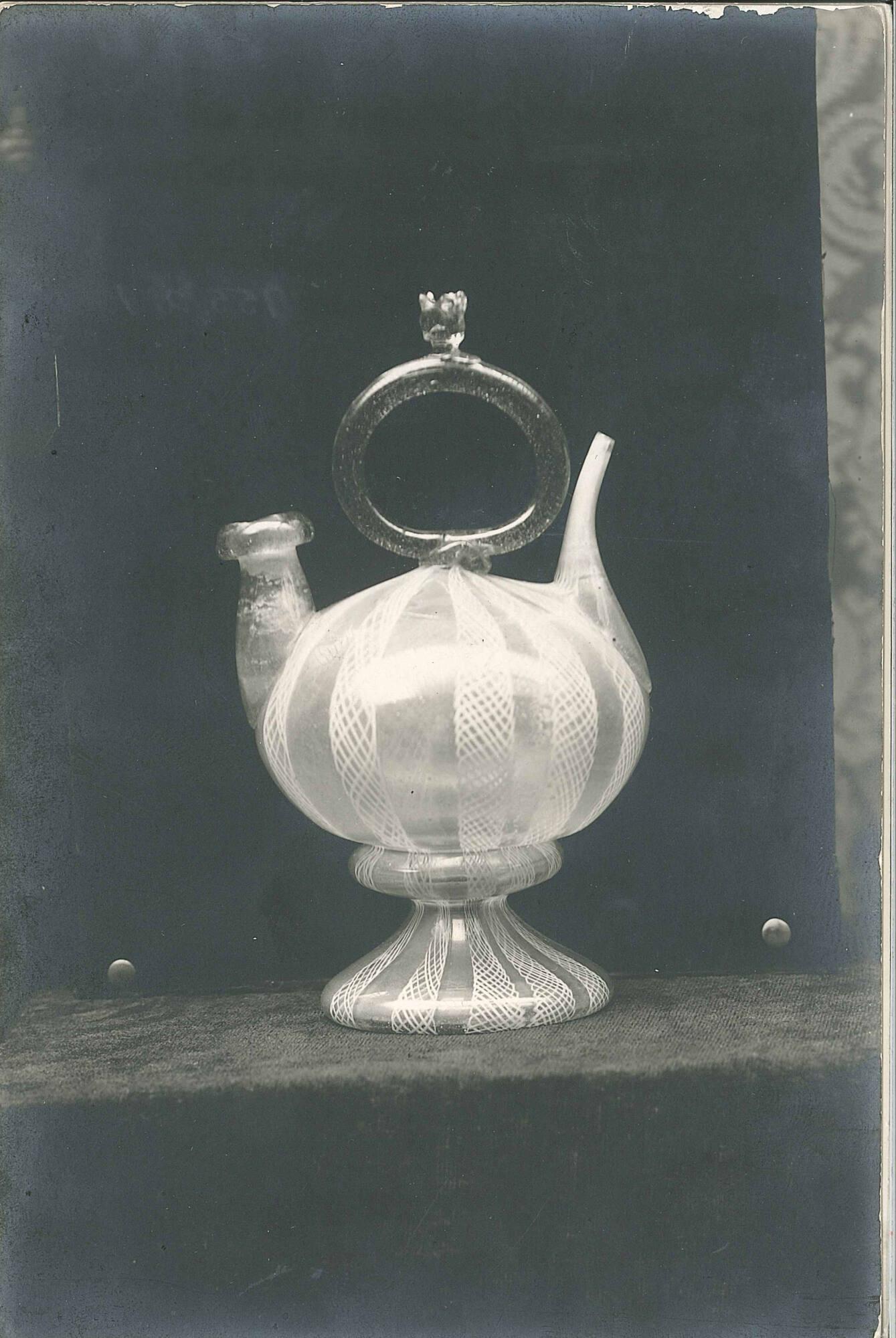 DescriptionPale rose color with neck and beak. Body fluted spirally. Neck and beak surmounted by circular handle with cock ornament at top.