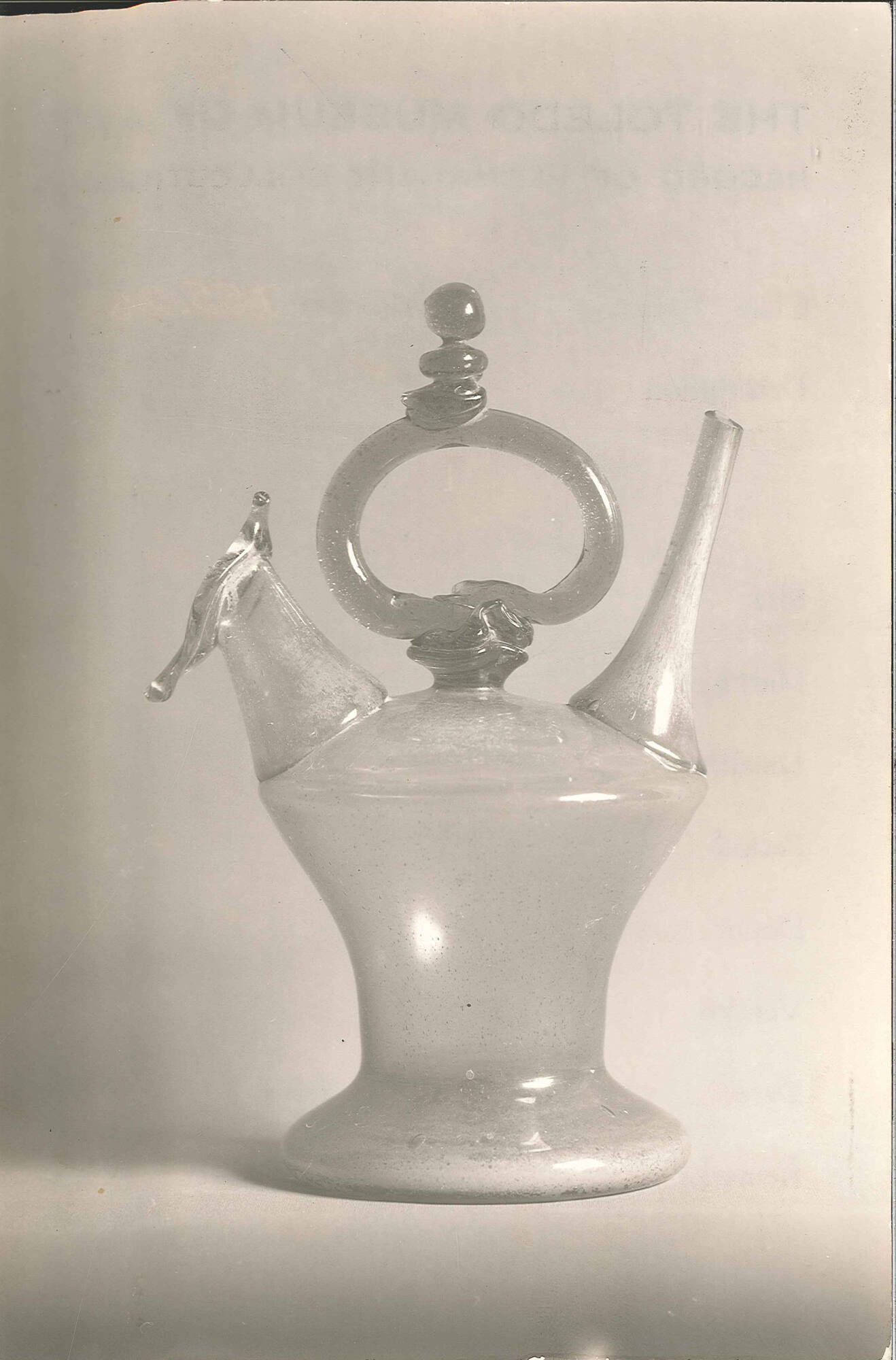 DescriptionLight greenish glass. Beak and drop-counting neck surmounted by a circular handle with knob on top.