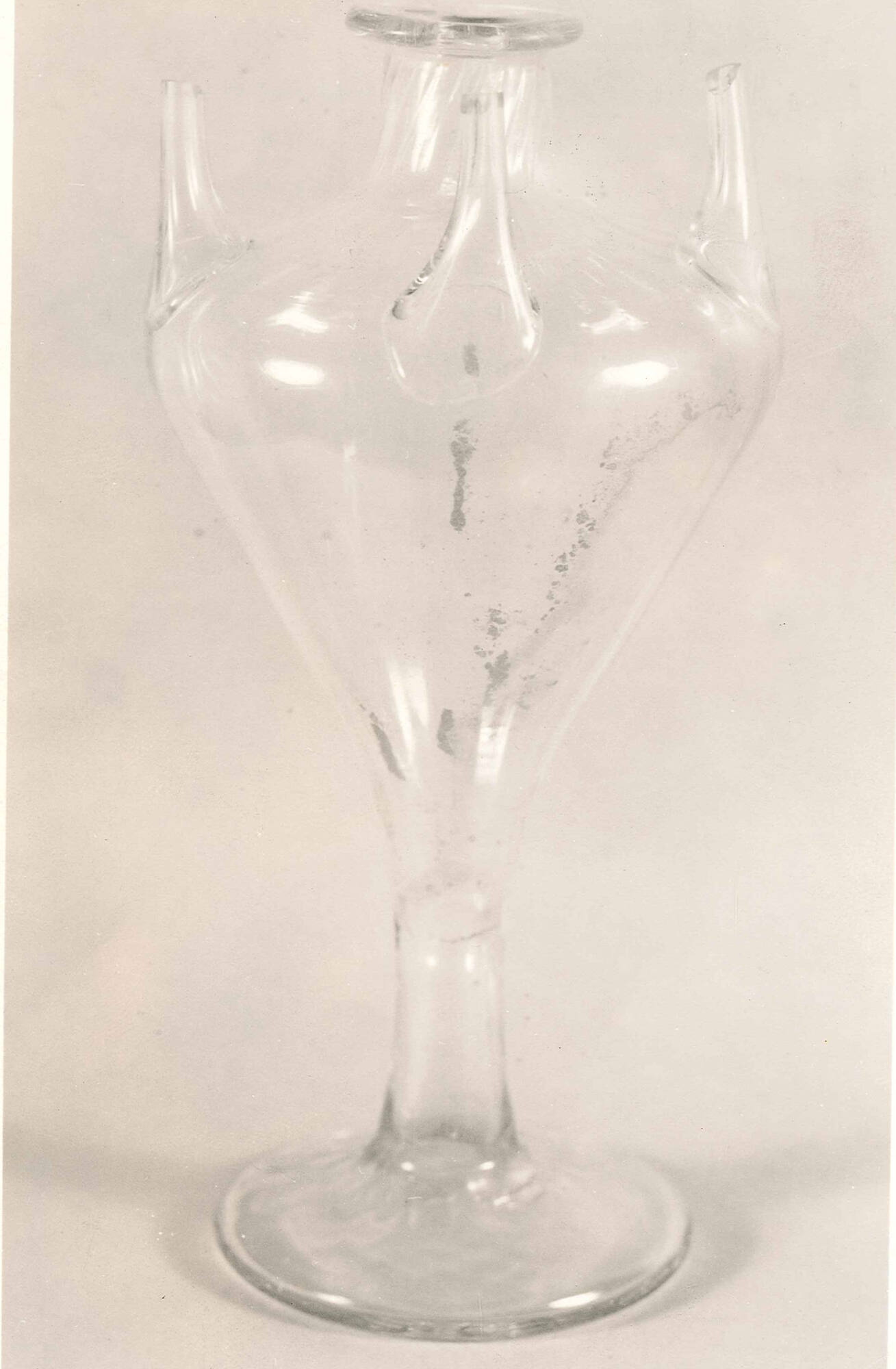 DescriptionConoid-shaped vase of clear glass with a fluted vertical design; four small beaks and neck in center. Large circular base.