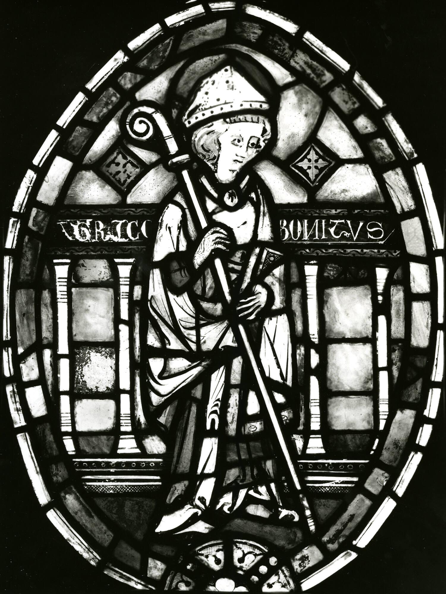 DescriptionIn a mandorla: A bishop standing upright wearing a mitre and holding a sceptre.