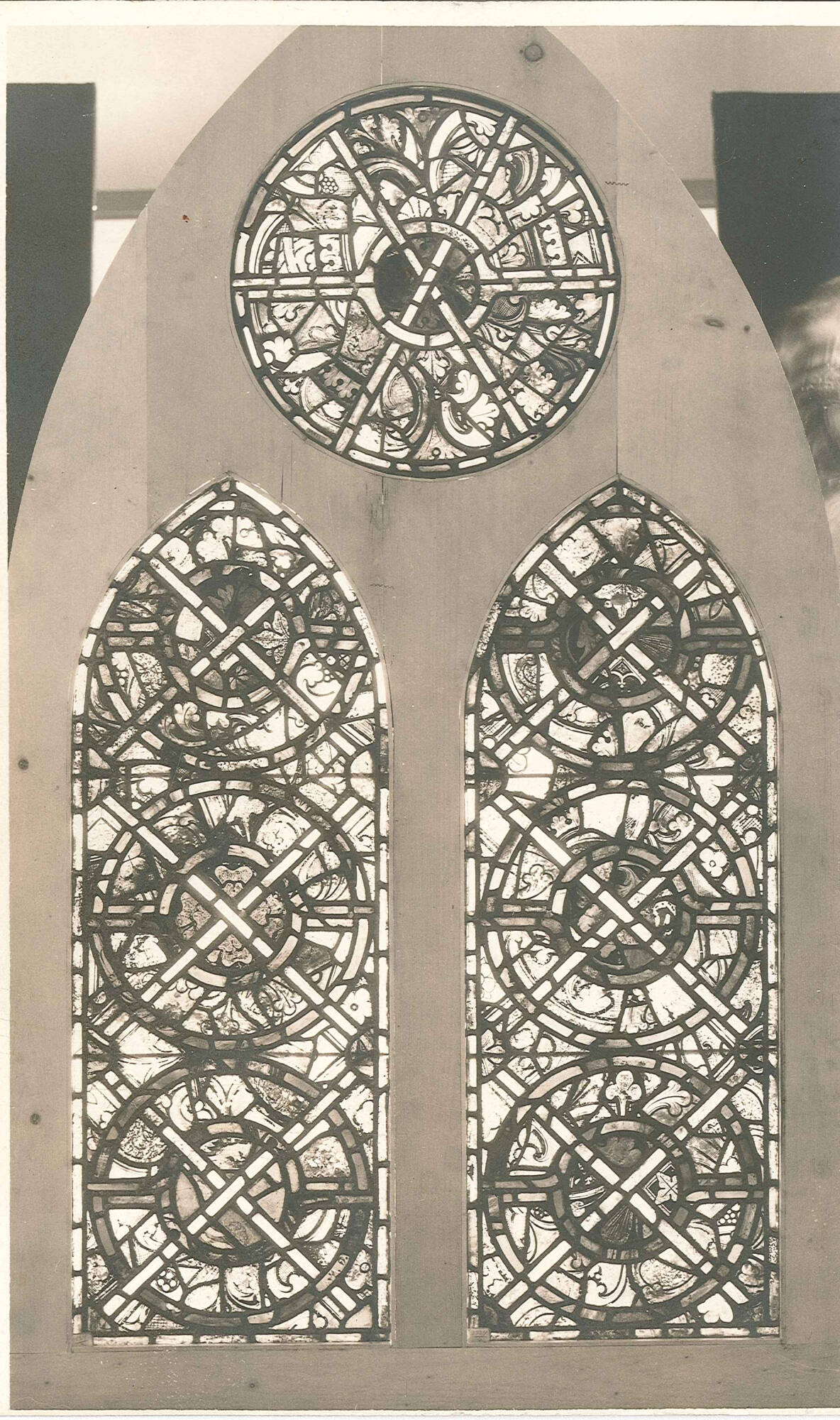 DescriptionPanel, roundel-shaped. Grisaille patterned with strapwork arabesques and medallions of early Gothic foliage.